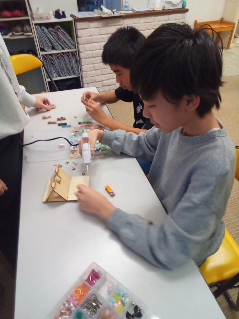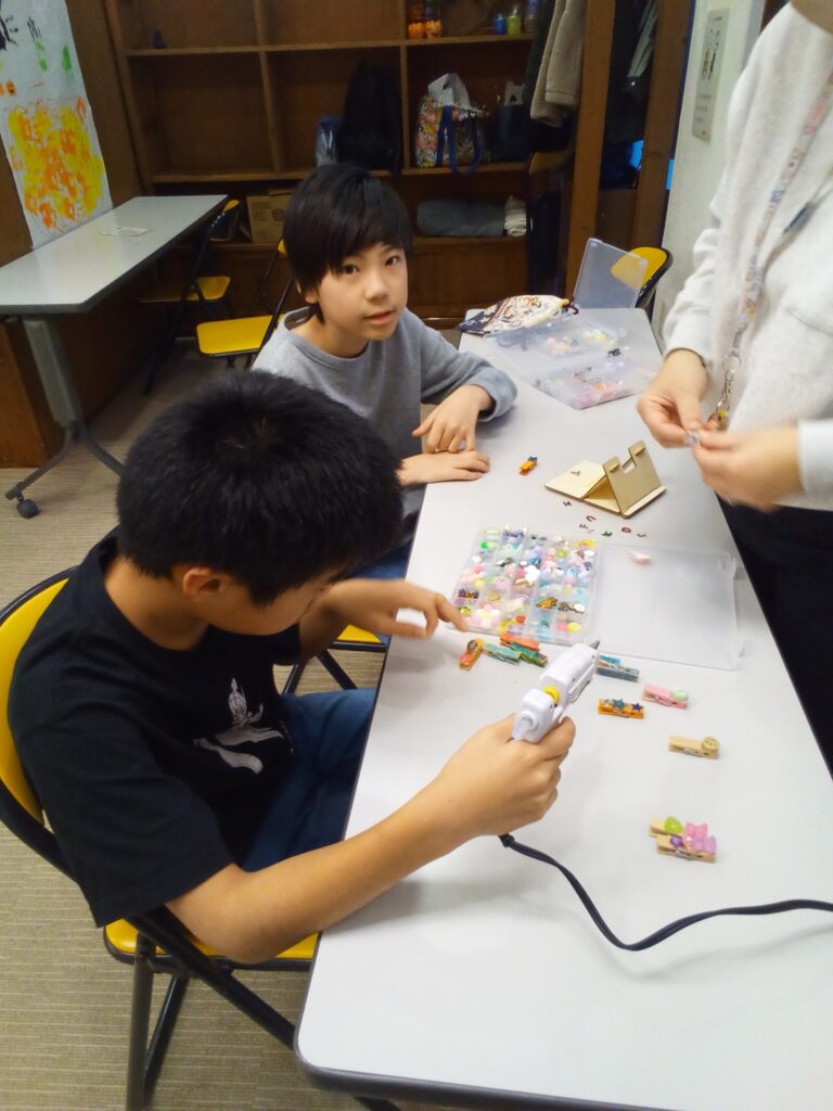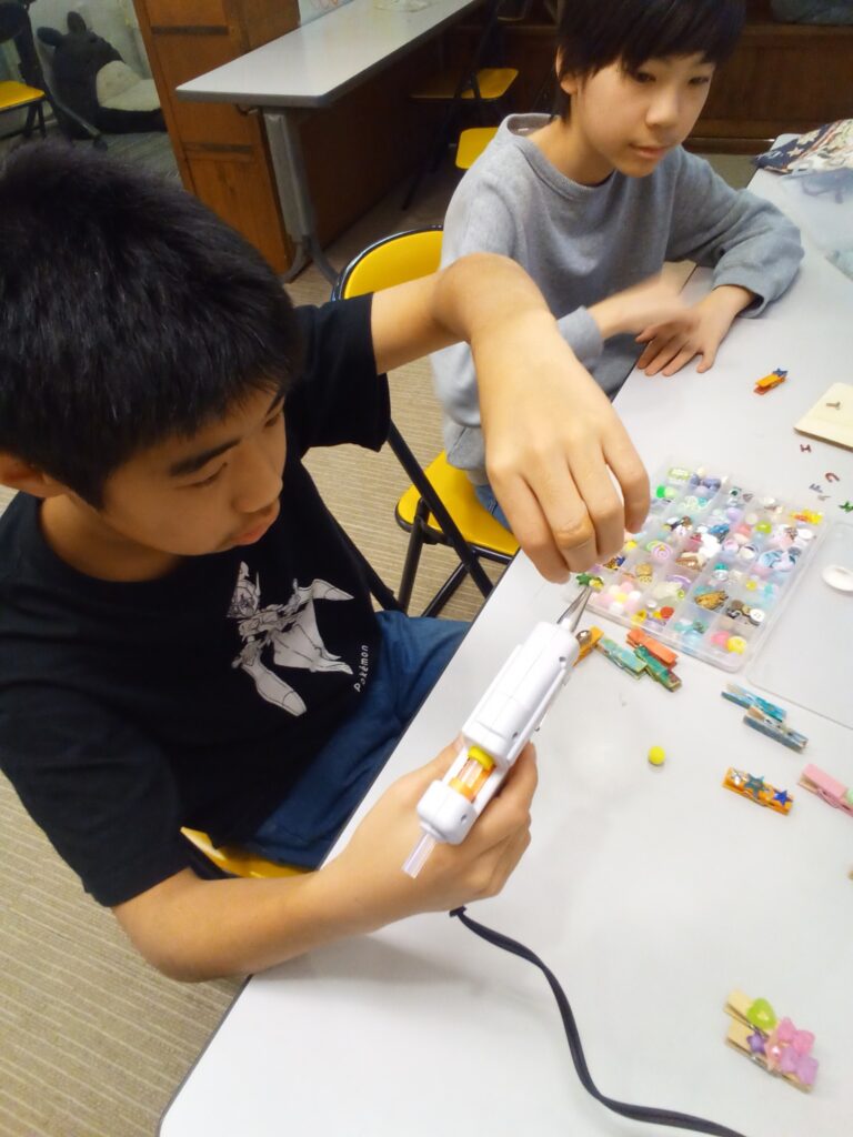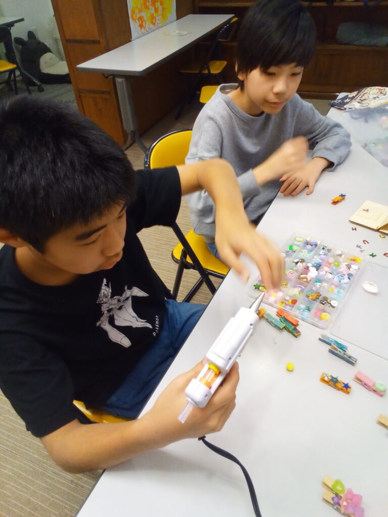 クリップづくりは、ビーズなどを木製クリップにグルーガンでくっつけて作りました。